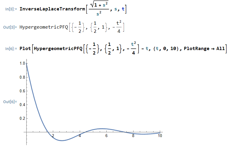 $$ f(t) = {\cal L }^{-1} \left[\frac{ \sqrt{ s^2 + 1}}{s^2} \right](t)$$