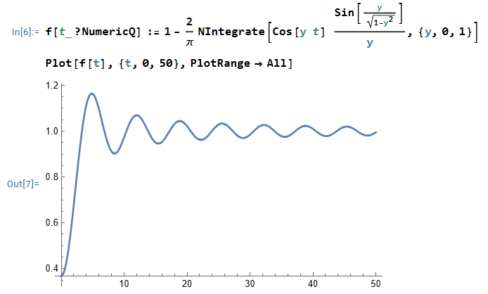 $$ f(t) = 1 -\frac{2}{\pi} \int_0^1 \cos (yt) \sin \left( \frac{y}{\sqrt{1-y^2}} \right) \frac{dy}{y}$$
