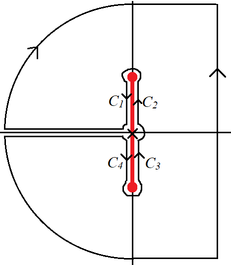 역 Laplace 변환을 Bromwich 적분으로 표현하면 $$f(t) = \frac{1}{2\pi i}\int_{\gamma-i\infty}^{\gamma +i\infty} F(s) e^{st}ds=\frac{1}{2\pi i} \int_{C} \frac{1}{z}\exp \left(- \frac{z}{\sqrt{1+z^2}} +z t \right) dz$$ 적분경로 $C= \{C_1+C_2+C_3+C_4+C_\epsilon + \text{half circle}\}$는 그림의 폐경로에서 오른쪽 $z=\gamma$ 을 통과하는 수직선을 제외한 나머지 부분이다. 제곱근 함수 때문에 branch cut을 $z=\pm i$을 연결하는 선분으로 잡는다. 이 경우 위상은 $$ -\frac{\pi}{2} \le \arg(z-i) , ~\arg(z+i) \le \frac{3\pi}{2}$$ 로 잡을 수 있다.