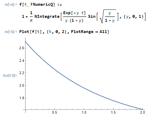 $$f(t) = e^{t} + \frac{1}{\pi} \int_0^1 \frac{e^{xt}}{x(x-1)} \sin \left( \sqrt{\frac{1-x}{x}} \right) dx \\ = e^t\left[ 1+ \frac{1}{\pi} \int_0^1\frac{e^{-yt}}{y(1-y)}\sin \left( \sqrt{\frac{y}{1-y}} \right)dy \right]$$