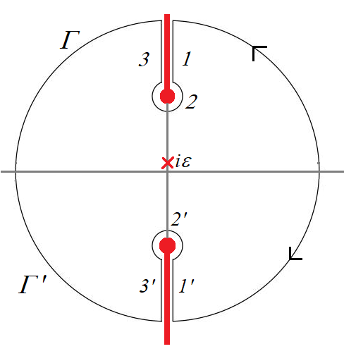 경로 $1'$에서 $z=y e^{-i\pi/2}$, $z-i = (y+1) e^{-i \pi/2}$, $z+i= ( y-1) e^{-i\pi/2},~(y:\infty\to1)$이므로