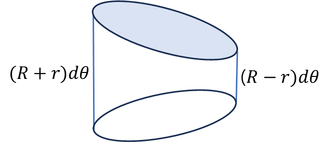 따라서 이 고리띠의 미소면적 $(R+r\cos \alpha) d\theta \times (rd\varphi)$을 $\varphi$에 대해 적분하면 $$ \text{고리띠 면적}= dA = \int_0^{2\pi}(R + r\cos\varphi) rd\varphi = 2\pi r R d\theta$$이 결과를 $\theta$에 대해 적분하면 토러스의 면적을 얻을 수 있다.