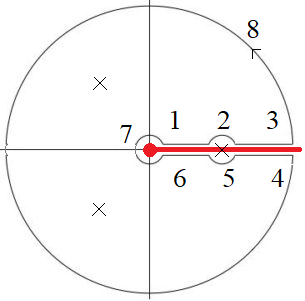 $z= 1, e^{i 2\pi/3}, ~e^{i 4\pi/3}$은 $f(z)$의 simple pole이고, $z=0$은 branch point이다. cutline은 $+x$으로 잡자. 그러면 $0\le \arg(z) \le2\pi$로 선택할 수 있다. 그리고 $z=1$은 cut line에 위치하므로 그림처럼 우회하자($C_2$와 $C_5$)