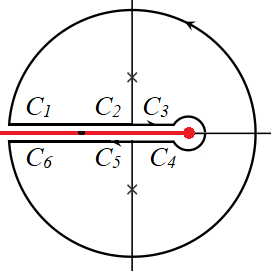 그런데 $0 \le x \le 1$에서 \begin{gather} \left| -x + i \sqrt{1-x^2}\right|=\left | -x- i \sqrt{1-x^2} \right| \\= \left| x - i \sqrt{1-x^2}\right| = \left| x + i \sqrt{1-x^2}\right| =1\\ \arg\left( -x + i \sqrt{1-x^2}\right)=-\arg\left( -x- i \sqrt{1-x^2} \right) \\ \arg\left( x - i \sqrt{1-x^2}\right) =-\arg \left( x + i \sqrt{1-x^2}\right)\end{gather}이므로 \begin{gather} \int_{C_2+ C_5} = 0, \quad \int_{C_3+C_4} = 0 \end{gather}이다. $C_\infty$와 branch point을 감싸는 $C_\epsilon$에서 적분은 기여가 없으므로 residue 정리에 의해서