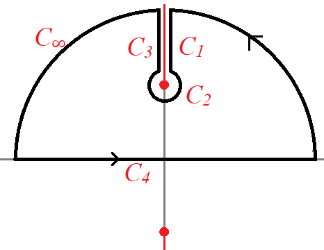 $C_1$과 $C_3$에서 적분은 cutline을 시계방향으로 건널 때 $\log(1+iz)$는 $2\pi$의 위상이 더해짐을 고려하고($\log(1-iz)$는 upper cutline 전후에서 위상변화가 없으므로 $C_1,C_3$에서 적분기여가 없다), $$ \arg(1+iz) = - {\pi}, ~~\arg(1-iz) =0 ~~\text{on}~~C_3$$이므로 \begin{gather}\int_{C_1 + C_3} f(z) dz = - \int_{C_3}\frac{ -\frac{1}{4} (\log|1+iz| +i\pi )^2 +\frac{1}{2} (\log |1+ iz| + i \pi) \log|1-iz|}{z^2}dz \\ + \int_{C_3} \frac{ -\frac{1}{4} ( \log|1+ i z| - i \pi )^2 +\frac{1}{2}(\log | 1+iz| -i \pi) \log|1-i z|}{z^2 }dz \\ = i \pi \int_{C_3} \frac{\log | 1+iz| - \log |1-iz| }{ z^2 }dz \qquad (z= iy) \\ = \pi \int_1^\infty \frac{\log|1-y| - \log|1+y|}{y^2 }dy\qquad (y = 1/u) \\ = \pi \int_0^1 \big( {\log (1-u) - \log(1+u)} \big) du = -2\pi\log 2 \end{gather} $C_\infty, ~C_2$에서 적분은 0에 수렴함을 쉽게 알 수 있다. 따라서 $\oint f(z) dz = 0$에서
