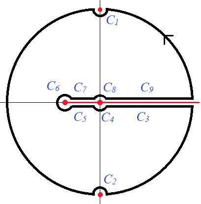 $C_3$과 $C_9$에서는 분모의 두 $\log$함수의 위상이 상쇄되므로 0에 수렴함도 알 수 있다. 마지막으로 $C_5$와 $C_7$는 $\log(2z)$의 cutline에 해당하지 않으므로 적분기여가 없어서,