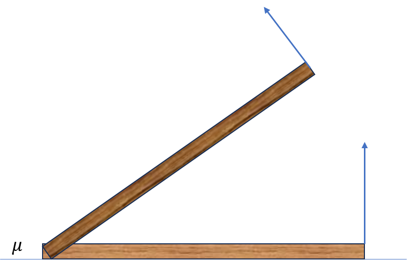 막대의 한쪽 끝을 매우 서서히 위로 밀어서 세우려 한다. 힘 방향이 막대에 항상 수직이게 작용할 때 바닥에 접촉하는 막대의 끝이 미끄러지지 않으려면 마찰계수는 얼마이어야 하는가?