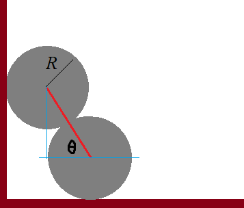마찰이 없으므로 실린더의 회전운동은 없고, 위 실린더는 아래로 내려가는 운동을, 아래 실린더는 수평운동만 한다. 두 실린더가 접촉을 하는 동안 위쪽 실린더의 중심 높이를 $y$, 내려가는 속력은 $v_y$, 아래쪽 실린더의 수평위치를 $x$, 수평속도를 $v_x$, 그리고 두 실린더의 중심을 연결하는 선분이 수평과 이루는 각을 $\theta$라면