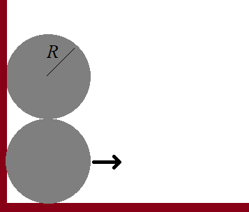 두 개의 동일한 실린더 그림과 같이 쌓여 있다. 밑에 있는 실린더에 오른쪽으로 살짝 충격을 주어 움직이게 만든다. 아래 실린더가 가질 수 있는 최대속력은? 바닥, 벽, 실린더 사이의 마찰은 무시할 수 있다.
