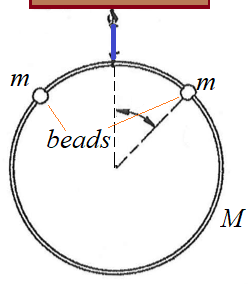 줄에 매달린 링의 꼭대기에 동일한 구슬 두 개가 있다. 충분히 무거운 구슬이 아래로 미끄러지는 운동을 시작하면 어느 순간에 링이 위로 솟구칠 수 있다. 그 조건은?