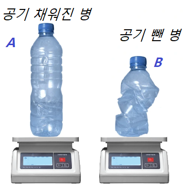 저울 위에 공기가 들어 있는 패트병을 올렸을 때 눈금과 공기를 완전히 빼서 찌그러진 패트병을 올렸을 때 눈금 중 큰 쪽은?