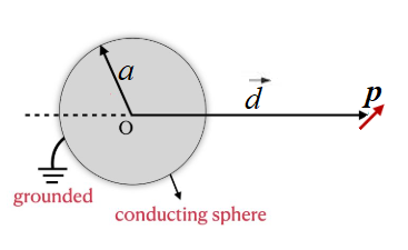 접지된 도체구 주변에 쌍극자 모멘트가 $\vec{p}$인 점쌍극자가 놓여있다. 도체구에 유도되는 알짜 전하는?