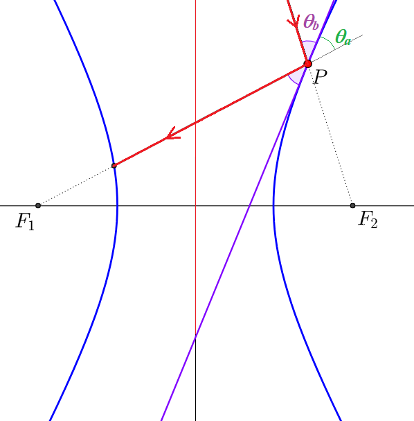 $$ \cos \theta_a = \cos \theta_b$$임을 의미한다. 즉 한 초점($F_2$)으로 입사하는 광선이 쌍곡선의 접선과 이루는 각은 반사되어 다른 초점($F_1$)을 향하는 광선이 접선과 이루는 각도가 같아 빛의 반사의 법칙을 만족한다. 같은 원리로 쌍곡선 한 쪽 내부에서 반대편 초점을 향해서 입사하는 광선은 그 내부의 초점에 모이게 된다.