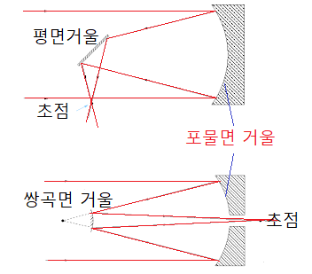 먼 곳의 별의 한 지점에서 나와 망원경 입구로 들어오는 빛은 거의 평행광선이므로 반사망원경을 쓸 경우 반사거울을 포물면 모양으로 만들면 포물선의 초점에 모이게 된다. 그러나 초점이 빛이 들어오는 경로에 있어 eyepiece를 사용할 수 없으므로 초점 앞에서 작은 거울을 이용해서 직각으로 반사시켜 경통 밖에서 초점이 형성되게 만든 망원경이 뉴턴식 반사망원경이다. 평면거울 대신 초점 근처에 작은 쌍곡면 거울을 놓고 반사경 중심에 뚫린 작은 구멍 밖에 초점이 생기게 만든 반사망원경이 카세그레인식(Cassegrain Telescope) 망원경이다. Hubble 망원경은 기본적으로 카세그레인식 이지만 주 거울을 포물면 대신 쌍곡면을 사용하였다(Ritchey-Chrétien telescope).일반적으로 카세그레인식 망원경이 뉴턴식에 비해서 경통이 짧다고 한다.