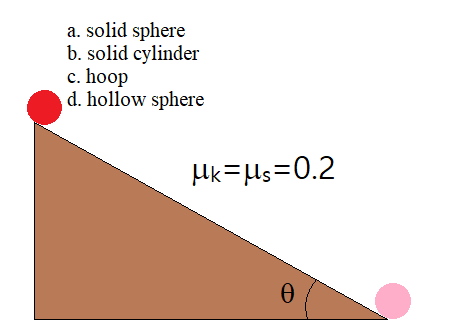 경사면과 물체 사이의 마찰계수가 $\mu_k = \mu_s =0.2$인 경사면 높은 곳에 물체를 놓아 내려가게 한다. 바닥에 도착했을 때 운동에너지가 가장 큰 물체는? 단, $\theta=20^\circ$이고 물체의 질량은 모두 같다.