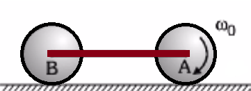 동일한 디스크 두 개의 중심이 가벼운 막대로 연결되어 있고, 앞 디스크는 처음 각속도 $\omega_0$로 시계방향 회전을 한다. 이 두 디스크를 바닥에 놓았을 때 앞바퀴와 달리 뒷바퀴에 작용하는 마찰이 충분히 커서 미끄러지지 않고 구르는 운동을 한다. 두 디스크는 처음 질량중심이 오른쪽 가속도를 가지지만 A의 각속도는 감소를 한다.