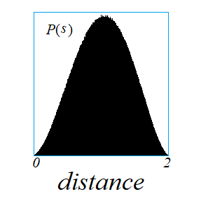 로 계산이 된다. 이 확률밀도함수의 최대값은 $s=1$이 아니라 $s=\frac{1}{5}\sqrt{105}-1=1.04939$ 에서 나온다. $P_3(s)$를 이용하면$$ <s>= \int_0^2 P_3(s) s ds = \frac{36}{35}$$를 얻고, 거리의 역수의 평균은$$ <\frac{1}{s}> = \int_0^2 P_3(s) \frac{1}{s} ds = \frac{6}{5}$$도 얻을 수 있다.