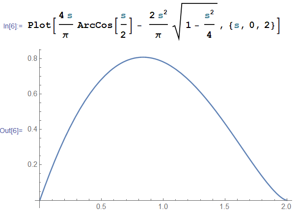 $$=\frac{4s}{\pi} \cos^{-1} \frac{s}{2} - \frac{2s^2}{\pi} \sqrt{ 1 -\frac{s^2}{4}} $$