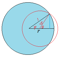 두 경우 모두 단위원과 겹치는 영역의 원호의 길이는 그림에서 $2(\pi - \theta)s$인데, $$\sin \varphi = s \sin \theta,~~~~\cos \varphi - s \cos \theta = r$$