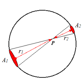 $$\frac{q_1}{q_2}= \frac{A_1}{A_2} = \frac{r_1^2}{r_2^2 }$$ 그런데 전기장의 세기는 거리의 제곱에 반비례하므로 두 원뿔의 바닥면에 모인 전하가 P점에 만드는 전기장의 세기는 같고 방향은 반대이므로 상쇄된다. 이 과정은 P점을 기준으로 한 모든 미소원뿔 쌍에 대해서 성립하므로 내부에서 전기장은 0임을 쉽게 보일 수 있다.