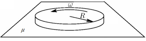힌트: 원판을 미소링으로 분해를 한 후 각 링에 작용하는 마찰력에 의한 토크를 계산하자. 반지름 $r$과 $r+dr$ 사이의 링이 만드는 마찰토크는 (원판의 단위면적당 질량=$\sigma$)
