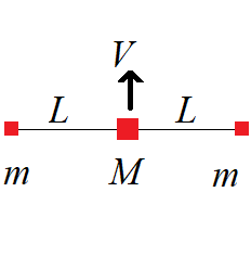 그림과 같이 3 물체가 줄(전체 길이=$2L$)로 연결되어 있다. 물체 $M$에 충격을 주어 줄에 수직한 방향으로 $V$의 속도로 움직이기 시작한다. 질량 $m$인 두 물체가 충돌하기 직전 줄에 걸리는 장력은?