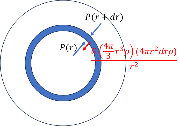 풀이: 반지름 $r$이고 두께가 $dr$인 별 내부의 미소구각를 고려할 때 안쪽에서 받는 압력($P(r):\text{outward}$)과 바깥쪽에서 받는 압력($P(r+dr): \text{inward}$)에 의한 힘의 차이가 구각에 작용하는 중력과 같아야 평형상태를 유지할 수 있다.