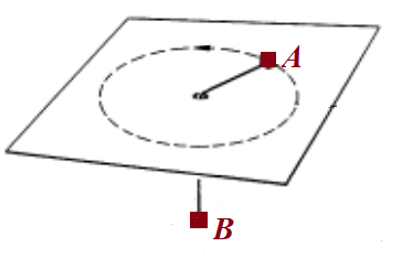 마찰이 없는 테이블 중앙에 있는 구멍을 통해 두 물체 A와 B가 줄로 연결되어 있다. B를 고정한 채 A를 일정한 각속도 $\omega_0$로 회전시킨다. 이때 구멍에서 A까지 거리는 $r_0$이다. 이제 B가 움직일 수 있게 놓아둔다면 그 순간 B의 가속도는?