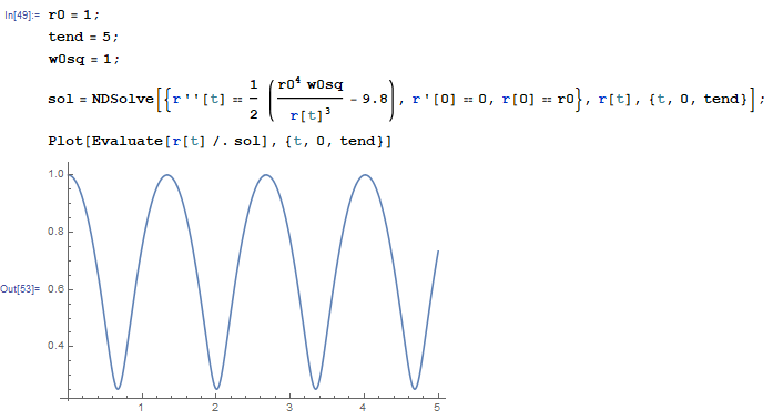 $$ \ddot{r} = \frac{m_A \omega_0^2 r_0^4/ r^3 -m_B g}{m_A +m_B}$$이 미분방정식을 수치적으로 풀 수 있다. $m_B$에 걸리는 중력은 구멍에서 $m_A$까지 길이를 짧게 하려고 하지만, 각운동량 보존때문에 줄이 짧아지면 centrifugal barrier가 높아지게 되므로 다시 길이가 늘어나는 운동을 반복한다. 이는 행성의 타원궤도 운동과 유사한 특성을 가진다.