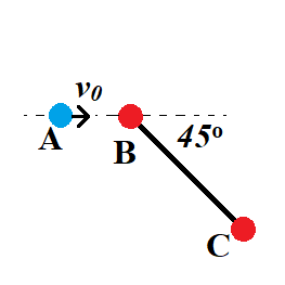 힌트: 정면충돌을 하므로 충돌 후 A의 속도성분 $v_1~(EE)$는 충돌 전과 나란한 방향이고, B의 속도는 막대방향 성분 $v_2~(SE)$와 막대에 수직인 성분 $v_3~(NE)$로 분해하자. 충돌 직후에서 막대의 장력에 의해서 C는 $v_2$의 막대방향 속도성분을 가진다. A와 B의 충돌이 탄성적이므로 충돌 전후의 상대속도의 크기가 같아야 한다.