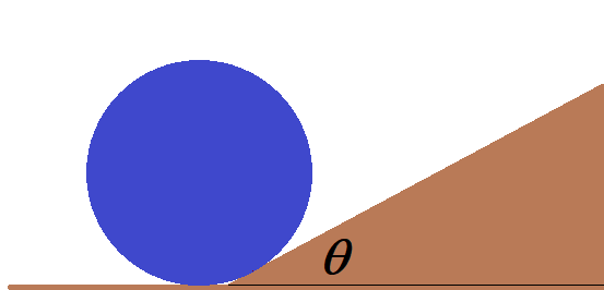 바닥에서 구르는 원판이 그림과 같이 경사각 $\theta$인 경사면에 올라선다. 바닥과 경사면의 기하학적 구조 때문에 원판은 경사면과 충돌을 하게 되므로 질량중심이 움직이는 속도가 변하게 되고, 또 미끄러짐이 없이 경사면을 오르기 위해서는 회전각속도도 순간적으로 변해야 한다. 즉, 에너지 손실이 생기게 된다(이를 방지하기 위해서는 바닥과 경사면이 연결되는 부분을 충분히 smooth한 곡선모양으로 만들어주어야 한다) 얼마의 에너지 손실이 생길까?