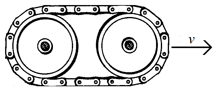 벨트에 대해서는 앞-뒤 바퀴에서 절반 감긴 부분은 바퀴와 동일하게 회전하면 앞으로 전진하므로 hoop의 rolling과 같다. 벨트 중 바퀴에 감기지 않는 위쪽 부분(길이= $(L - 2\pi R)/2$)은 $2v$, 아래쪽 부분(길이=$(L-2\pi R)/2$)은 정지한 상태이다. 벨트의 단위길이당 선밀도를 $\mu$, 전체 길이를 $L$이라 하면