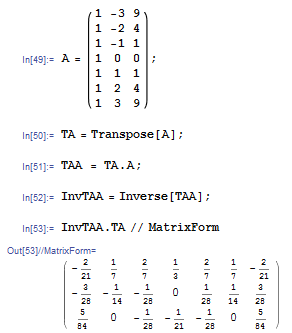 이 식은 임의의 $k$-차 다항식을 이용한 경우에도 사용할 수 있다. 이 경우 행렬(scattering matrix) $\bf A^T \cdot A$는 $(k+1)\times (k+1)$의 대칭행렬이 된다. 행렬 $\bf A$는 다항식의 찻수와 피팅에 사용이 될 데이터의 구간의 크기가 주어지면 정해지므로, 윗 식에서 $({\bf A}^T\cdot {\bf A})^{-1}\cdot {\bf A}^T$의 첫 행 ($a_0$을 $d$로 표현하는 식의 계수들)을 구하면 코드 내에서 결과를 lookup table로 만들어서 사용할 수 있다. 아래 표는 mathematica 를 이용해서 윈도 크기가 7 (7개 점)인 경우 2차 다항식을 사용할 때 계수를 구하는 과정이다.