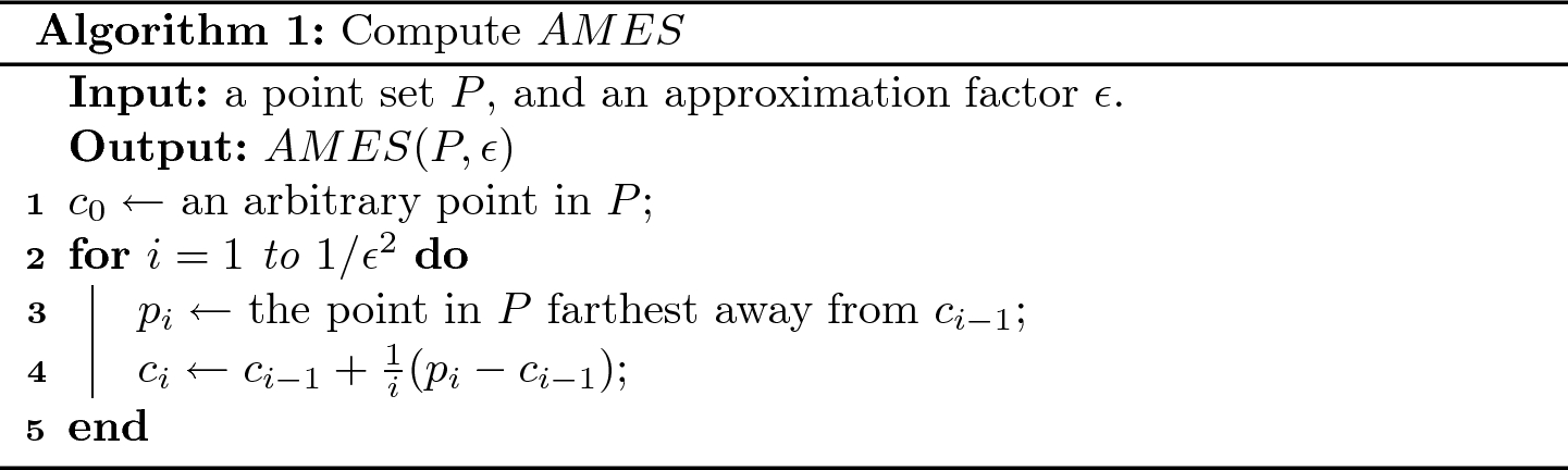 void ApproxMinBall(std::vector<CPoint> &pts, double epsilon, CfPt ¢er, double &radius) {