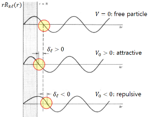 이다. 상호작용이 없을 때 radial 해 $j_\ell (kr)$가 상호작용이 켜지면 $R_{k\ell}(r)$로 바뀌게 되는데, $\delta_\ell$을 그 변형의 정도가 얼마인가를 측정하는 파라미터에 해당한다. 상호작용이 인력이면 산란파가 산란 중심으로 끌어당겨지게 되어 $\delta_\ell>0$이고, 척력이면 반대로 $\delta_\ell <0$임을 예측할 수 있다. phase shift $\delta_\ell$은 radial 해가 만족해야 할 경계조건으로 부터 구해진다.